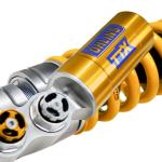 Realizzato con tecnologia Ohlins TTX con un pistone interno da 36mm, è un ammortizzatore monotubo a gas ad alta pressione con serbatoio esterno “piggy back” regolabile in estensione (o ritorno), e regolabile in compressione con regolatore idraulico del precarico della molla integrato e ha lunghezza interasse variabile. È possibile scegliere la taratura della molla in base al peso pilota e allo stile di guida in modo completamente gratuito.