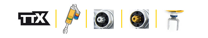 Realizzato con tecnologia Ohlins TTX con un pistone interno da 36mm, è un ammortizzatore monotubo a gas ad alta pressione con serbatoio esterno “piggy back” regolabile in estensione (o ritorno), e regolabile in compressione e ha lunghezza interasse variabile. È possibile scegliere la taratura della molla in base al peso pilota e allo stile di guida in modo completamente gratuito.