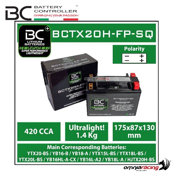 • Codici batterie piombo/acido corrispondenti: GYZ20H - YTX20H-BS - YTX20-BS - YB16-B-CX - YB16-B - YB16C-B - YB18-A - Y50-N18A-A - GYZ20L - GYZ20HL - YTX20HL-BS - YTX24HL-BS - YTX15L-BS - YTX18L-BS - YTX20L-BS - YB16HL-A-CX - Y50-N18L-A-CX - YB16L-B - YB16L-A2 - YB16CL-B - YB18L-A - YB18L-A2 - Y50-N18L-A - Y50N18L-A2 - Y50N18L-A3 - SYB16L-B - SY50-N18L-AT
