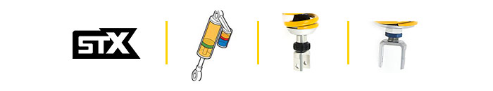Realizzato con tecnologia Ohlins STX con un pistone interno da 36mm, è un ammortizzatore monotubo a gas ad alta pressione con serbatoio esterno “piggy back” regolabile in estensione (o ritorno) e ha lunghezza interasse variabile. È possibile scegliere la taratura della molla in base al peso pilota e allo stile di guida in modo completamente gratuito.