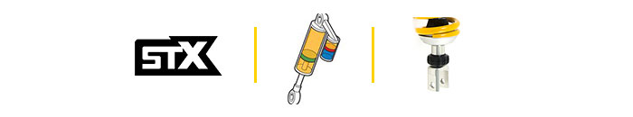 Realizzato con tecnologia Ohlins STX con un pistone interno da 36mm, è un ammortizzatore monotubo a gas ad alta pressione con serbatoio esterno “piggy back” regolabile in estensione (o ritorno). È possibile scegliere la taratura della molla in base al peso pilota e allo stile di guida in modo completamente gratuito.