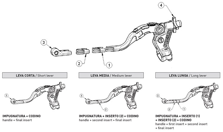The choice of the right center distance of the clutch control suitable to your needs starts from the knowledge of the center distance in use on your motorcycle, so as to understand if you have to increase it or decrease it. A longer center distance will have a greater wire recovery as a result you will have a clutch that comes off earlier but that requires a greater pressure strain. A shorter center distance will have a smaller wire recovery with the consequence that the clutch will come off later but will be softer to pressure.