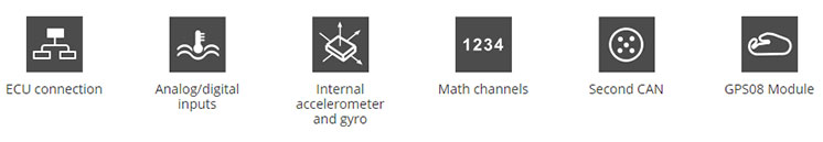 Compact TFT 5 "high contrast display (1.100 lumens), 6 configurable RGB LED alarms, 10 configurable RGB LED shift lights, 2 Motorsport connectors + 1 Binder connector, 3 CAN connections, connection to more than 1,000 ECU market protocols, inertial platform, 8 configurable analogue channels, 4 digital speed channels, 1 RPM channel, 2 digital outputs, fully configurable mathematical channels, Wi-Fi 802.11 connection, IP65