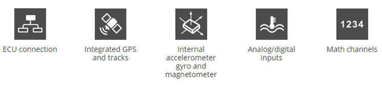 High contrast LCD, 7 configurable RGB backlight colors, ambient light sensor, 2 configurable RGB alarm LEDs, 5 configurable RGB shift light LEDs, 2 CAN connections, connection to 1,000+ industry leading ECUs, 4 fully configurable analog inputs, 3 digital inputs, 2 digital high-side outputs, integrated GPS, inertial platform, 4 GB internal memory, IP65.