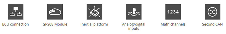 6" high contrast 1,100 lumen TFT display, 5 configurable RGB alarm LEDs, integrated 10 RGB LED shift light array, 2 Motorsport connectors + 1 Binder connector, 3 CAN connections, connection with 1,000+ industry leading ECUs, inertial platform, 8 analog inputs at a max of 1,000 Hz each, 4 digital speed inputs, coil RPM input, lap signal input, 2 digital outputs, realtime fully configurable math channels, 802.11Wi-Fi connection, IP65