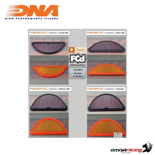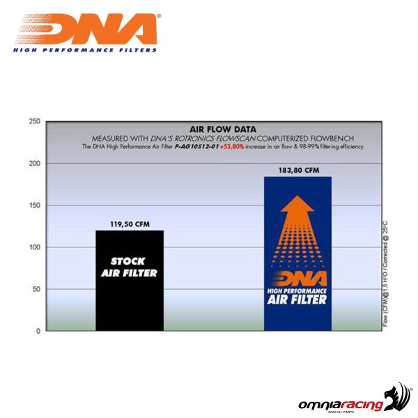 The DNA P-AG10S12-01 air filter for Mv Agusta F4 1000R are the ultimate expression of technology to ensure optimal engine breathing for your motorcycle, whether you're on the race track, city streets, or off-road. They are built with a high-quality plastic frame to prevent any deformation of the filter inside the airbox and are manufactured to precise mounting standards. The filter media consists of 4 layers of high-quality cotton wrapped in a metal mesh, allowing the filter to maintain its shape even under high air pressures, ensuring consistent efficiency and excellent performance of the filtering material. DNA air filters are designed to achieve maximum performance from your motorcycle's engine by providing increased clean air flow. In fact, these air filters boast an efficiency rate of 98-99%.