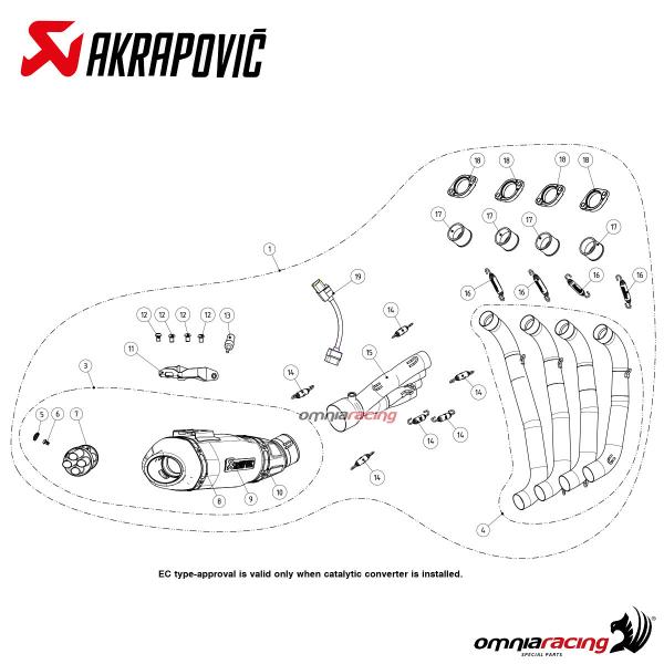 The installation of the Akrapovic muffler is easy without modifications, plug and play, it does not require remapping of the motorcycle control unit, anyway for maximum performance of this complete system it is preferable to proceed with a remapping. The kit supplied with fittings, clamps, bolts and everything needed for assembly.