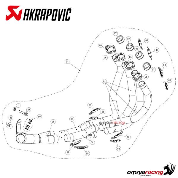 Made of high quality stainless steel, with low weight -6,4kg compared to stock OEM collectors, used with a Slip-On line and tested on the Akrapovic dyno, has a horsepower increase of 7,9 kW (10,8 HP) at 8600 rpm and a torque gain of 6,5 Nm at 2900 rpm, with a deep and aggressive racing sound.