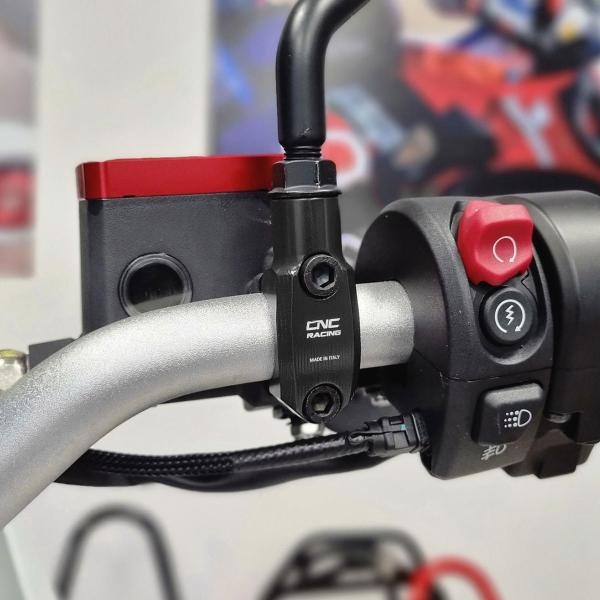 The black mirror clamp for Brembo OEM and RCS radial brake master cylinder and clutch master cylinder by CNC RACING CV011B is designed to guarantee maximum precision and characterized by a unique design, this clamp is made from solid light alloy using CNC machines and subjected to a surface anodizing process for long-lasting durability. time and impeccable aesthetics.