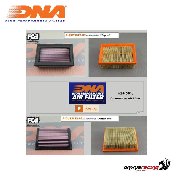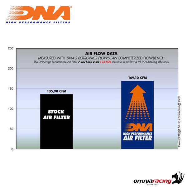 The DNA Racing air filter P-DU12S12-0R for Ducati Desmosedici RR 2008-2012 represents the ultimate in high-performance air filtration. Featuring the revolutionary DNA FCd (Full Contour design), it provides at least 20% and up to 80% more effective filtering area, precisely following the internal shape of the airbox—no matter how complex.