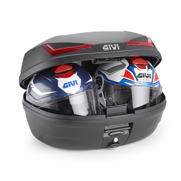 The Givi E455 SIMPLY IV top case in black with red reflectors is the latest evolution in the MONOLOCK range, building on the popular E450. With a 45-liter capacity, it can easily hold two full-face helmets, making it ideal for touring or everyday use.