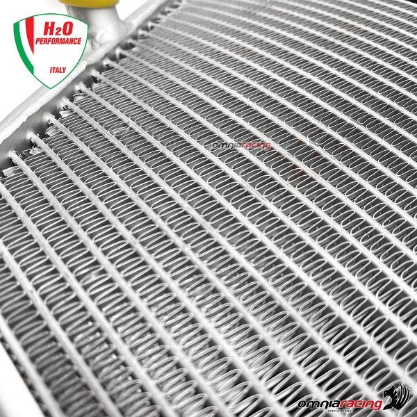 The standard radiators of the series are not designed for the high amount of work to which the engine is subjected in the race. H2O aluminum radiators are designed to overcome this shortcoming, keeping the engine cool and preserving it from breakage caused by overheating. The radiators for straddle applications are designed for certain working ranges at the most accessible possible cost, not suitable for the race regimes for which the stresses due to the use of the engine always almost to the limit. To keep costs down, OEM radiators are designed keeping the number of tubes (More expensive) and increasing the number of cooling fins (Much cheaper). H2O does the exact opposite designing its cooling radiators with a high number of pipes and fewer fins, also limiting dirt and debris that normally fit inside, obviously decreasing its efficiency. The sturdiness of the product is born in the welding of the tubes to the trays, avoiding the gluing the H2O aluminum radiator will certainly be more long-lived and robust. The use of aluminum and construction technology make it much lighter than an original radiator.