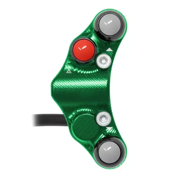 The Jetprime Left switchgear for Kawasaki Ninja H2R 2017-2023 is a high-performance Road-Use component made of CNC-machined 7075 Ergal Green anodized aluminum, designed for seamless installation and exceptional durability. Jetprime, a leader in motorcycle electronics, delivers a fully compatible Plug&Play unit with factory harness connections.