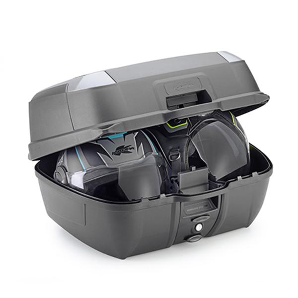 Kappa K45N Add versatility and load capacity to your trip with the 45 liter MONOLOCK top case, available in elegant black with gray side inserts. Complete with K628 plate and universal kit, this top case offers a reliable and durable solution for transporting your gear during your road adventures. Tested to resist bad weather, it ensures reliable protection even in heavy rain. With its capacity, it can easily fit two jet helmets, giving you enough space for your travel needs without compromising style or functionality.
