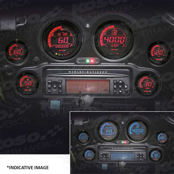 The KOSO HD-03 is a Plug & Play LED instrument set for Harley-Davidson FLHT, FLHX, and FLTR from 2004 to 2013. Designed to replace OEM instruments without modifications, it combines modern design and advanced functions with blue or red displays that completely black out when the bike is off.