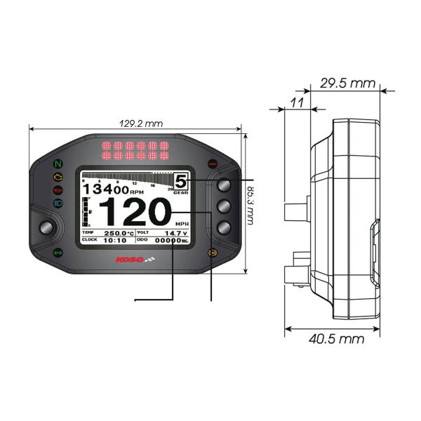 In addition to providing data such as speed, engine revolutions, total and partial odometer, gear indicator and clock, the KOSO RS2 also includes the Dyno function. This innovative feature allows you to measure the target distance and the target speed, turning every journey into a fun and performing experience.
