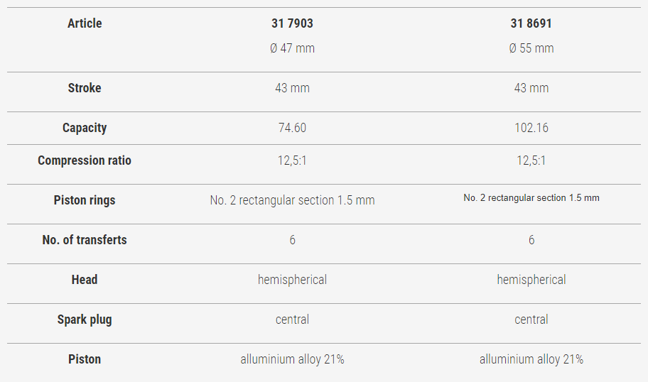 The segments are made of cast iron with high mechanical resistance. The head is made of die-cast aluminum alloy. The increased surfaces, machined with numerical control machines by diamond tools. The components are subjected to an antioxidant treatment, the tightness of the compression is delegated to a VIton gasket, hemispherical burst chamber with squish and candle in the center.