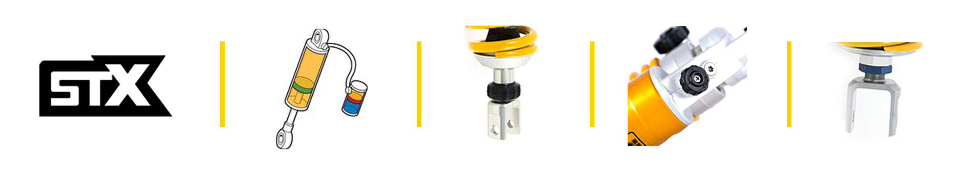Developed with Ohlins technology STX has a 36mm internal piston, it's a monotube high pressure gas type of shock absorber with hose mounted external reservoir. it's adjustable rebound damping and adjustable compression damping and has variable wheelbase length. It is possible to choose the spring setting for free with rider weight and riding style.