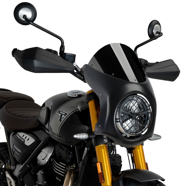 The PUIG 9515N Carbon Look/Black windscreen for Triumph Speed Twin 900 2023-2025, model Retrovision Semi Fairing merges racing aesthetics with advanced aerodynamic performance. Built from premium materials, this PUIG windshield for Triumph Speed Twin 900 2023-2025 increases wind protection at high speeds and adds a distinctive, refined touch to your motorcycle’s front end. The shape has been developed for perfect alignment with the fairing, ensuring seamless fitment with no modifications required.