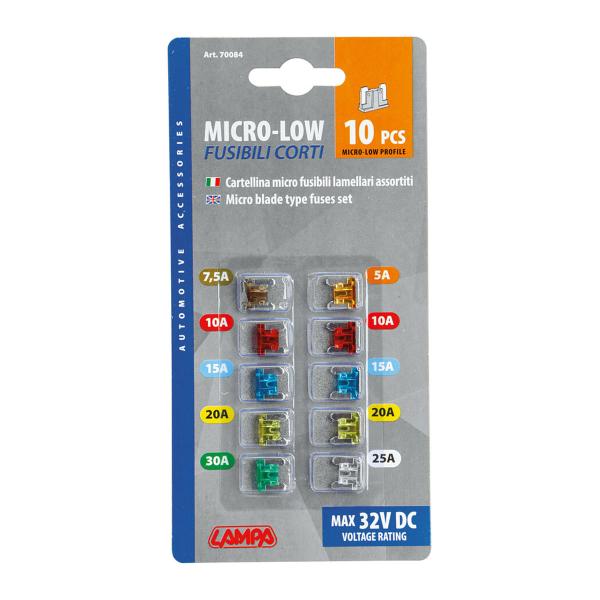 Set of 10 micro-low profile blade fuses Lampa 12/32V for motorbikes and scooters
