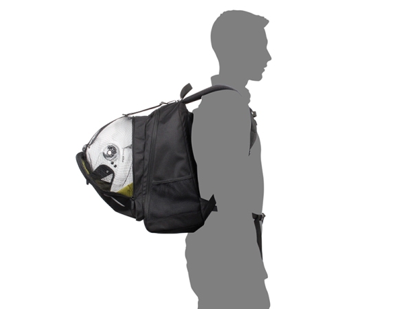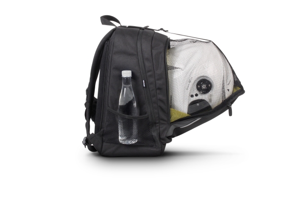 • Mesh pocket with zipper for helmet storage, with 2 adjustable straps for stability