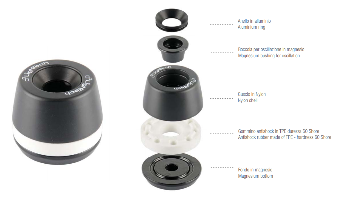 The protection consists of an extremely rigid Nylon body and tested to protect the motorcycle from shocks and slips. They have a truncated cone shape and also have a rubber band available in different colors to match the color of their motorbike.