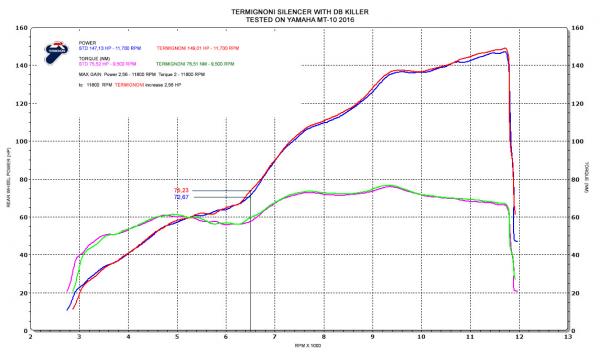 In terms of performance the silencer with a power increase of + 2.56 Hp at 6.500 rpm and an increase of + 2 Nm at 6.500 rpm