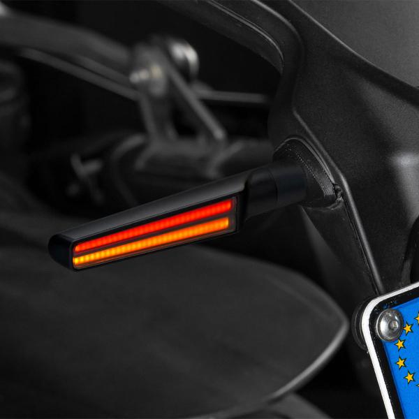 Gli indicatori di direzione posteriori Paraxite Project 003 con luce di posizione stop rossa segnano una nuova frontiera nel settore, essendo i primi del loro genere a combinare la tecnologia a LED COB con un lampeggio sequenziale. Questo sistema offre un effetto visivo distintivo, caratterizzato da una sequenza di accensione continua e uniforme, che migliora significativamente la visibilità e l'attrattiva estetica della moto.