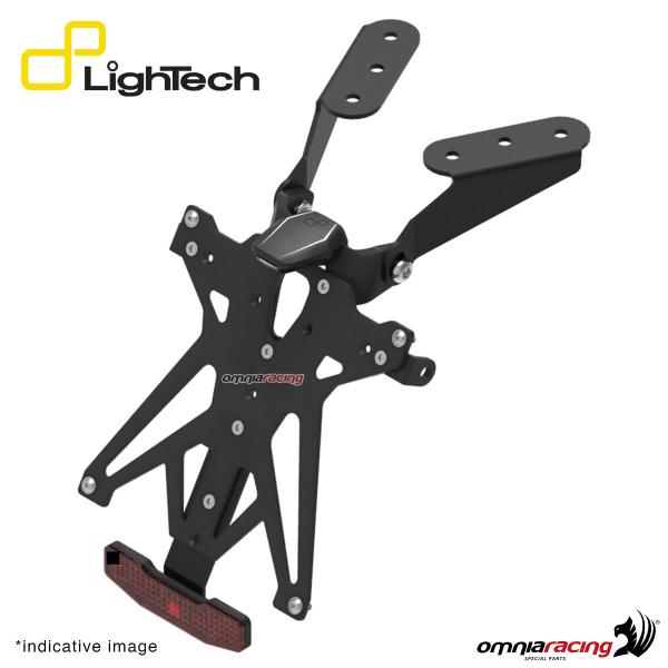 La sua regolabilità in diverse posizioni permette di personalizzare l'angolo e l'altezza del portatarga per adattarsi alle tue preferenze estetiche e alle esigenze di montaggio. Inoltre, il portatarga Lightech include una luce targa e un catadiottro montato con un angolo di 30°, garantendo la piena omologazione legale.