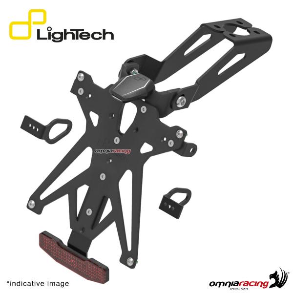 La sua regolabilità in diverse posizioni permette di personalizzare l'angolo e l'altezza del portatarga per adattarsi alle tue preferenze estetiche e alle esigenze di montaggio. Inoltre, il portatarga Lightech include una luce targa e un catadiottro montato con un angolo di 30°, garantendo la piena omologazione legale.