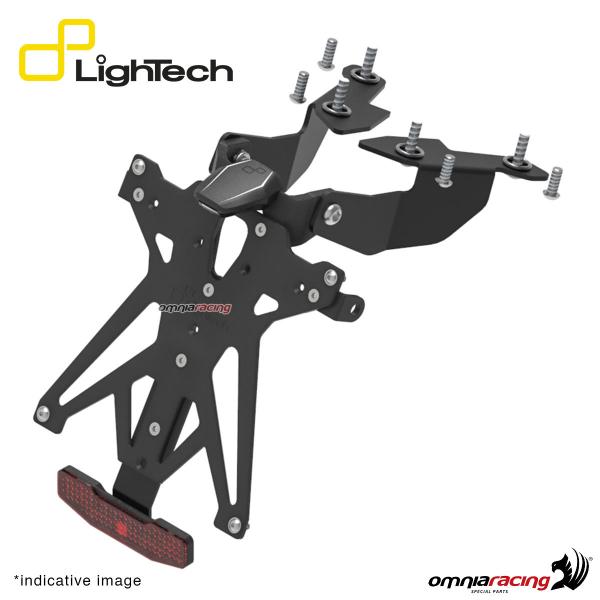La sua regolabilità in diverse posizioni permette di personalizzare l'angolo e l'altezza del portatarga per adattarsi alle tue preferenze estetiche e alle esigenze di montaggio. Inoltre, il portatarga Lightech include una luce targa e un catadiottro montato con un angolo di 30°, garantendo la piena omologazione legale.