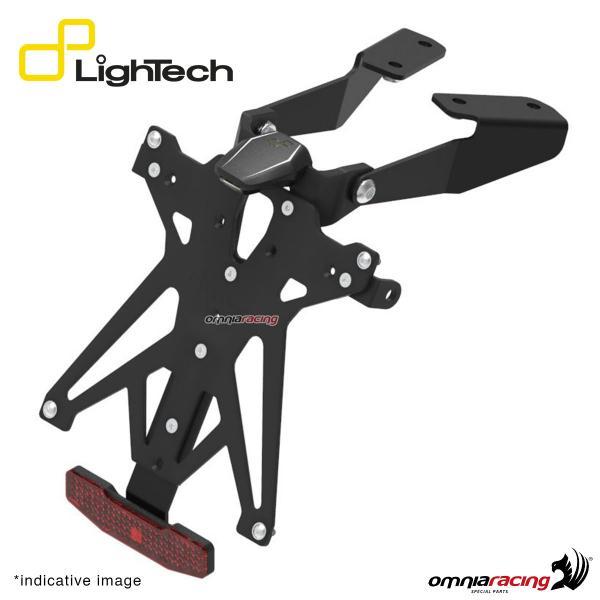 La sua regolabilità in diverse posizioni permette di personalizzare l'angolo e l'altezza del portatarga per adattarsi alle tue preferenze estetiche e alle esigenze di montaggio. Inoltre, il portatarga Lightech include una luce targa e un catadiottro montato con un angolo di 30°, garantendo la piena omologazione legale.