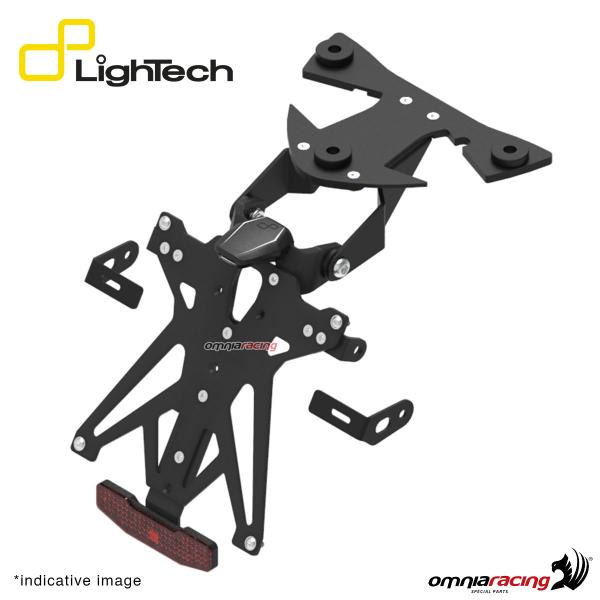La sua regolabilità in diverse posizioni permette di personalizzare l'angolo e l'altezza del portatarga per adattarsi alle tue preferenze estetiche e alle esigenze di montaggio. Inoltre, il portatarga Lightech include una luce targa e un catadiottro montato con un angolo di 30°, garantendo la piena omologazione legale.