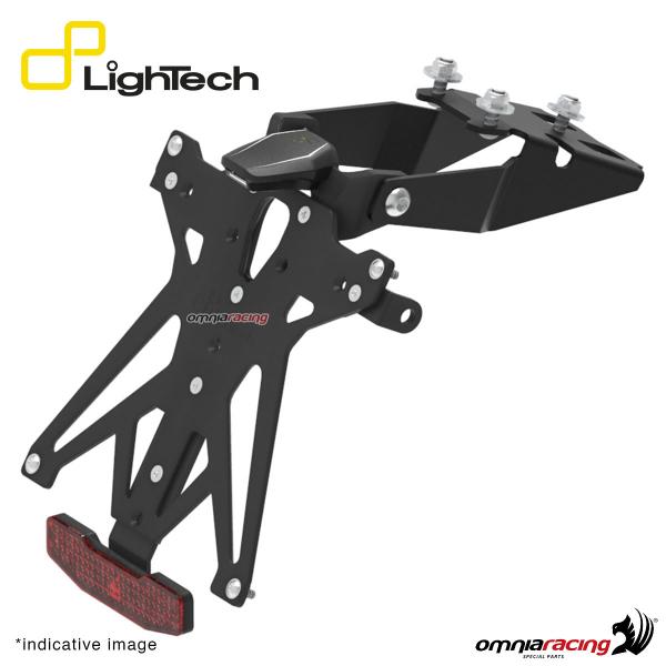 La sua regolabilità in diverse posizioni permette di personalizzare l'angolo e l'altezza del portatarga per adattarsi alle tue preferenze estetiche e alle esigenze di montaggio. Inoltre, il portatarga Lightech include una luce targa e un catadiottro montato con un angolo di 30°, garantendo la piena omologazione legale.