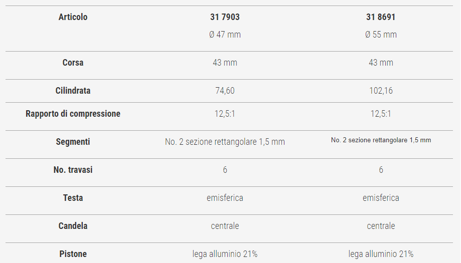 Il Pistone è in lega speciale di alluminio ad alto tenore di silicio, lavorato mediante macchine CNC, alleggerito e rinforzato, le superfici risultano maggiorat eper ottimizzare lo scambio termico.