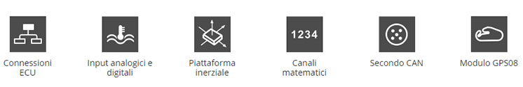 Display extra large TFT 7" ad alto contrasto (1.100 lumen), 8 allarmi LED RGB configurabili, 10 shift light LED RGB configurabili, 2 connettori AMP + 1 connettore Binder, 3 connessioni CAN, connessione a più di 1.000 protocolli ECU del mercato, piattaforma inerziale, 8 canali analogici configurabili, 4 canali velocità digitali, 1 canale RPM, 2 uscite digitali, canali matematici completamente configurabili, IP65.