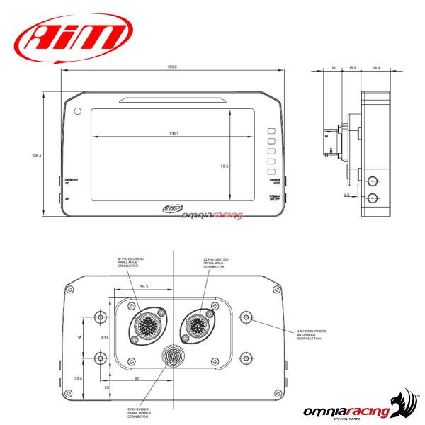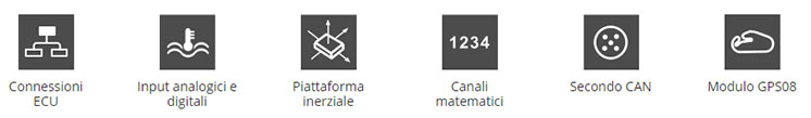 Display TFT 6" ad alto contrasto (1.100 lumen), 5 allarmi LED RGB configurabili, 10 shift light LED RGB configurabili, 2 connettori Motorsport + 1 connettore Binder, 3 connessioni CAN, connessione a più di 1.000 protocolli ECU del mercato, piattaforma inerziale, 8 canali analogici configurabili, 4 canali velocità digitali, 1 canale RPM, 2 uscite digitali, canali matematici completamente configurabili, connessioneWi-Fi 802.11, IP65.