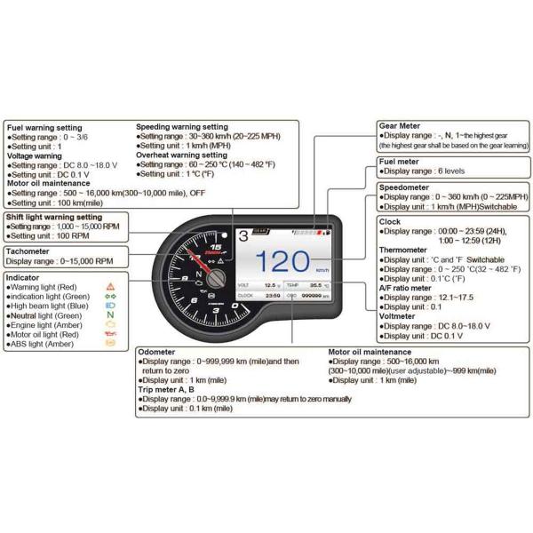 • Contagiri: Fino a 15.000 RPM, con luce di cambio marcia personalizzabile