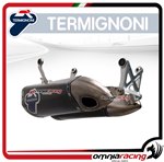 I terminali di scarico e le marmitte complete Termignoni sono realizzate con i migliori materiali disponobili sul mercato. Nel rispetto dei canoni che ogni terminale deve avere in termini di leggerezza e prestazioni utilizzando carbonio di altissima finitura, Titanio, metallo leggero e prestazionale, ed acciao di altissima qualità, semplice o con lavorazione Poppy (Effetto carbon look). Ogni scarico porta vantaggi ed incrementi in termini di prestazioni rispetto allo scarico originale montato dalla moto o dallo scooter. L'incremento di potenza in cavalli degli scarichi Termignoni è tra i più alti paragonato ad altri produttori. Il "sound" è qualcosa che DOVETE sentire.