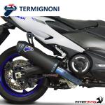 L'impianto completo per Yamaha T-max 560 termignoni è totalmente racing quindi NON omologato. Il terminale presenta una camicia in titanio verniciata di nero, fondello in carbonio, fascette in titanio Blu, innesto in acciaio inox verniciato di nero e il classico Logo Termignoni rivettato sulla Camicia del silenziatore.